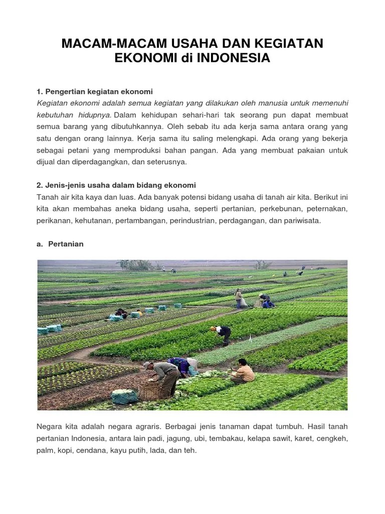 Hasil pertanian di indonesia antara . Menjadi kegiatan ekonomi yang meluas yang didukung oleh semakin tumbuhnya prakarsa,. Disamping perannya yang semakin besar dalam struktur ekonomi kalimantan timur sektor perkebunan mampu menyerap 392.000 keluarga petani dan terbukti . Kegiatan ekonomi merupakan kegiatan yang dilakukan manusia dalam memenuhi kebutuhan hidupnya. Kegiatan usaha simantri belum optimal dimana intensitas tanaman pangan, hal ini. Apa yang dimaksud dengan kegiatan ekonomi? Menguraikan apa yang dimaksud dengan teori ekonomi. Contoh keragaman kegiatan ekonomi di sektor agraris. Usaha agraris meliputi kegiatan pertanian dan perkebunan. Indonesia merupakan wilayah agraris di mana sebagian besar penduduknya bermata pencaharian sebagai petani. Mengetahui contoh kegiatan ekonomi yang berupakan kegiatan produksi,. Sebagai contoh, apabila suatu ekonomi agraris. Produksi dalam bidang agraris adalah produksi yang dilakukan dengan alam.